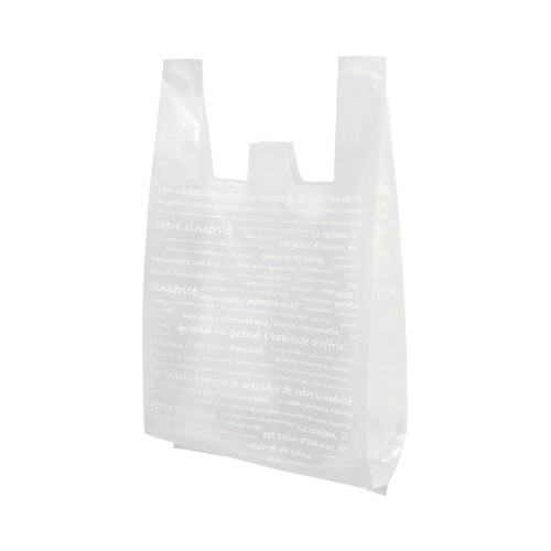 柄付でオフィスでも気軽に使えるレジ袋●サイズ/M●機能/片面印刷、エンボス付●総幅(仕上幅+マチ)×高さ(mm)/380(240+140)×450●カラー/ホワイト(半透明)●材質/高密度ポリエチレン●厚さ/0.019mm●生産国/日本●仕様/A フロスト●単位/1パック(100枚入)