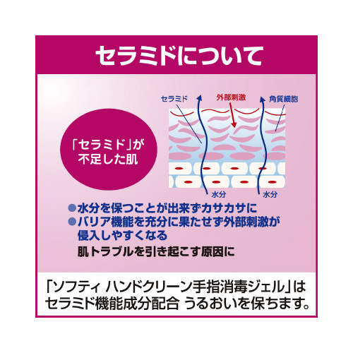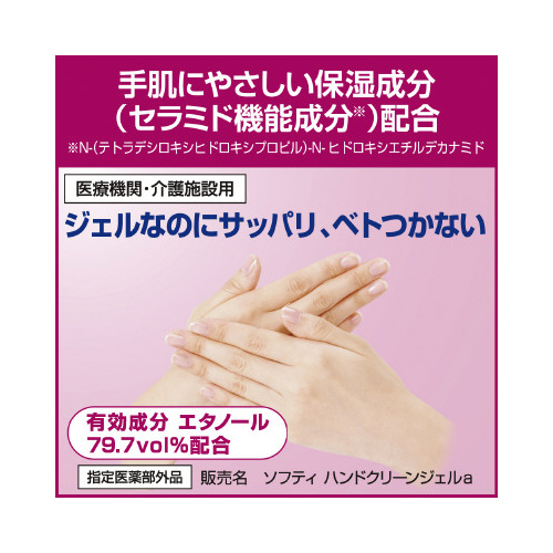 手肌にやさしいセラミド機能成分配合。下向きノズルが飛び散りを防ぎます。●寸法/幅104×奥行56×高さ177mm(納品時) 使用時高さ194mm●容量/400ml●有効成分/エタノール79.7vol%●成分/N‐(テトラデシロキシヒドロキシプロピル)‐N‐ヒドロキシエチルデカナミド、グリセリン、タルク、カルボキシビニルポリマー、トリエタノールアミン他●販売名/ソフティ ハンドクリーンジェルa●薬事分類/指定医薬部外品●単位/1本
