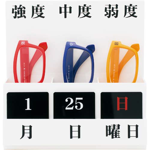 非常に目立つからお持ち帰りも回避。カレンダー付きで書類の記入にも便利。●種別/セット●寸法/スタンド+老眼鏡:幅190×奥行70×高さ195mm●材質/スタンド:アクリル、塩化ビニール、老眼鏡:ポリカーボネート、プラスチック●セット内容/カレンダー付きスタンド・老眼鏡3本(弱・中・強)●眼鏡度数/弱度:+1.5、中度:+2.5、強度:+3.5●単位/1セット