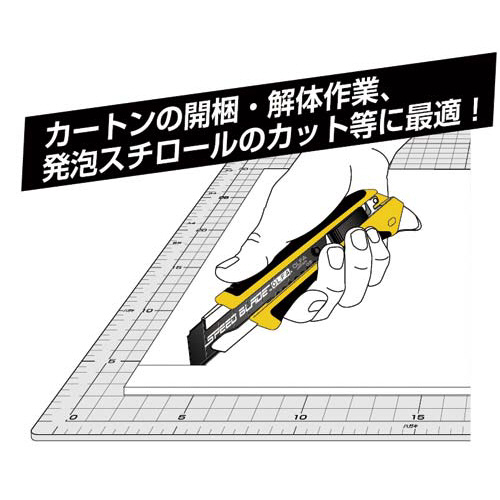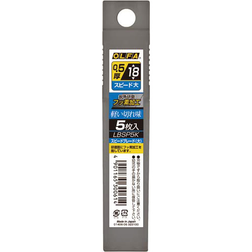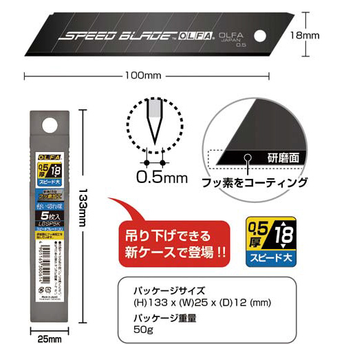 特専黒刃×フッ素加工で驚きの軽い切れ味!カートンの開梱、解体作業、発泡スチロールのカットに。替刃(大)を使用するカッターに付けられます。●種別/スピードブレード刃●寸法/110×18mm●材質/刃:合金工具鋼(フッ素コーティング)、再生ポリプロピレン樹脂●刃厚/0.5mm●刃幅/18mm●商品名/カッター替刃(黒刃・フッ素加工)●概要/特専黒刃(大)×フッ素加工●仕様/L型カッター用替刃●全長/110mm●単位/1パック(5枚入)
