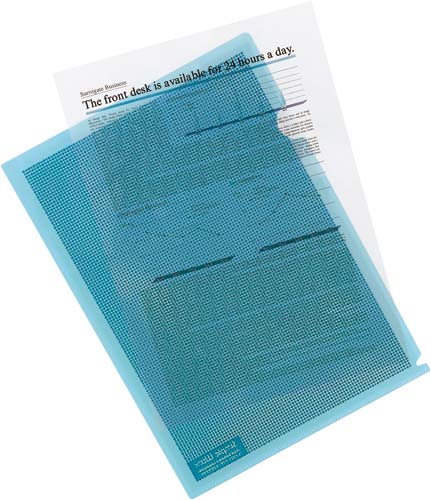 カモフラージュパターンにより、大きなタイトル文字はみえても中身は読めない。●サイズ/A4●寸法/縦310×横220mm●カラー/ライトブルー●材質/ポリプロピレン(PP)●厚さ/0.2mm●単位/1パック(5枚入)