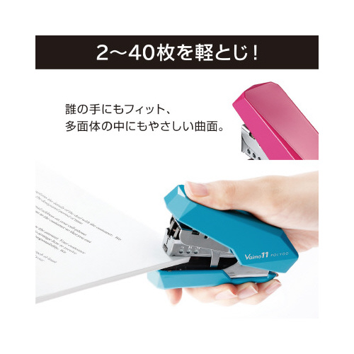 片手で2枚から40枚までを軽い力で綴じられる。女性でも力が入れやすいコンパクトサイズ。ダブルハンドルで失敗とじが少なく、綴じ裏が平らになるフラットクリンチなので積み重ねた書類もかさばりません!●カラー/ブルー●寸法/幅28×長さ98×高さ71mm●とじ奥行/最大28mm●針装填方式/ワンタッチオープン方式●装填数/50本●使用針/No.11-1M●とじ方式/フラットクリンチ●とじ枚数/約40枚●機能/リムーバー有●材質/本体プラスチック部は再生材使用、金属部とプラスチック部の分離廃棄可能●付属品/11号針1000本付●環境仕様/金属部とプラスチック部の分離廃棄可能●単位/1個