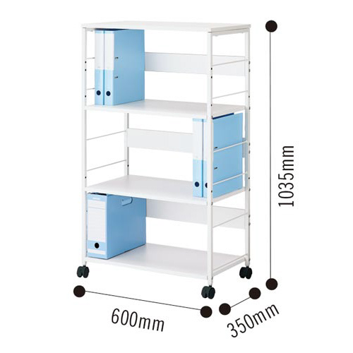 奥行600mm、高さ700mmのデスクサイドにぴったりのハイタイプのワゴン 。●種別/デスクサイドハイタイプ●カラー/ホワイト●外寸法/幅600×奥行350×高さ1035mm●天板厚さ/15mm●棚板寸法/幅564×奥行350×厚さ15mm●内寸法/幅564×奥行330×高さ上・中段317、下段270mm●材質/フレーム:スチール(粉体塗装)、棚板:メラミン化粧板(MDF)、キャスター:PP●質量/13kg●耐荷重/棚1段あたり:約10kg、天板:約10kg●棚板枚数/可動棚板:2枚(46mmピッチ・2段階)●機能/キャスターストッパー機能(2個)●仕様/上段背板前後使用選択可●付属工具/スパナ●生産国/中国●単位/1台