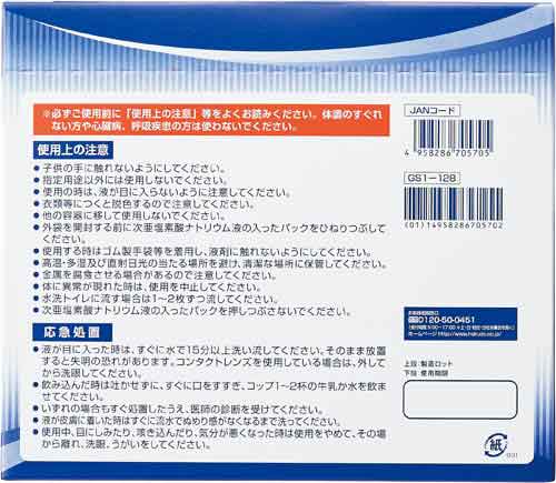 汚染物の付着した箇所の洗浄・除菌に。次亜塩素酸ナトリウム液の入ったパックを上からひねりつぶして開封するだけで、容易に使うことができ便利です。●寸法/箱:290×160×190mm、袋:230×110×30mm●質量/箱:1130g、袋:70g●材質/水解性パルプ●成分/次亜塩素酸ナトリウム、他●pH/約10.5●枚数/1セットあたり5枚入●単位/1箱(10セット入)