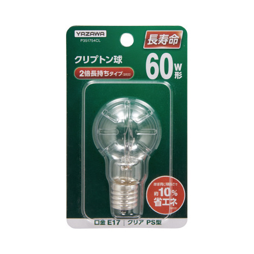 従来タイプより2倍長持ち、消費電力を約10%削減できます。(YAZAWA社比)●種別/60W形●口金/E17●カラー/クリア●寸法/35×長さ67mm●定格寿命/約4000時間●定格消費電力/54W●仕様/ガラス仕上:クリア●単位/1個