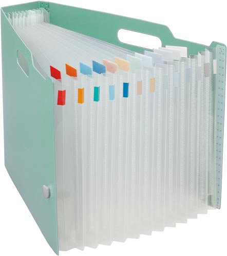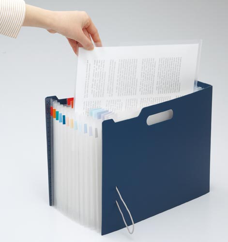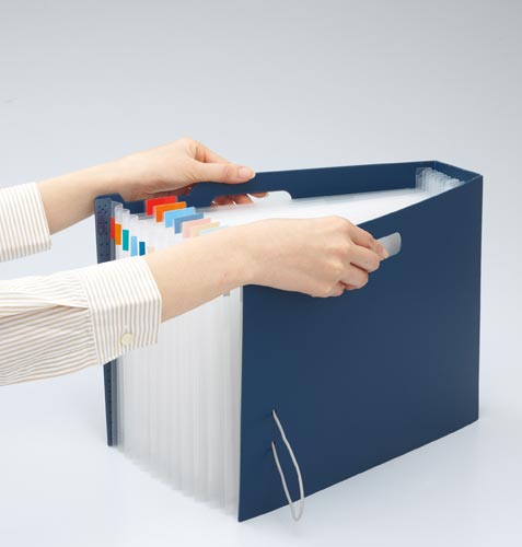 分類・検索性に優れたジャバラタイプのボックスファイル。卓上では大きく広げて使え、しまう時はスッキリ収納。●サイズ/A4ヨコ●カラー/ネイビー●寸法/幅70×奥行き341×高さ245mm●寸法(幅×奥行×高さmm)/70×341×245●材質/表紙・ポケット:再生PP、バンド留め具:PP、ゴムバンド:ポリエステル・スチール●ポケット数/12仕切・13ポケット●最大収容枚数/A4コピー用紙450枚●付属品/分類シール・インデックスシール付き●対応見出し寸法/幅12×長さ80mm(上下に5mmの余白要)●単位/1個