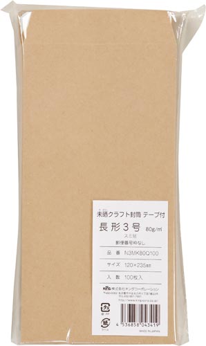 | 商品名 | 未晒クラフト封筒 長3 テープ付き 100枚入 |