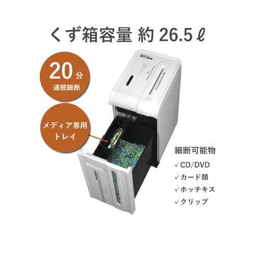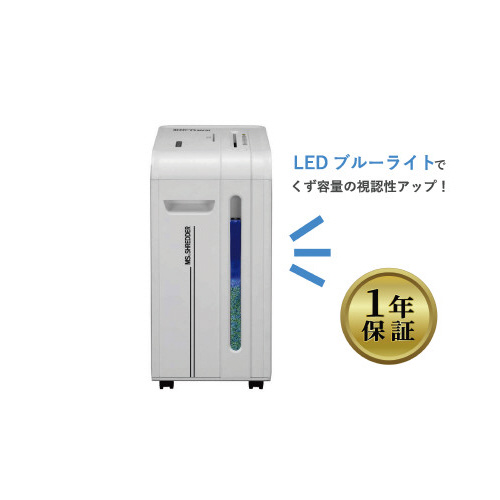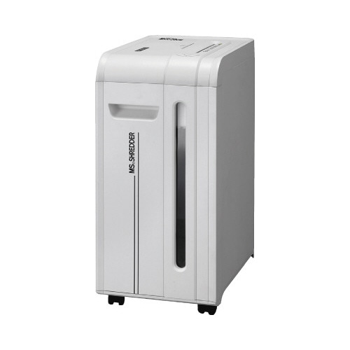 明光商会 MSシュレッダー MSRシリーズ。抜群の耐久性。経済産業省の安全基準を上回る試験をクリア。充実の機能を完備。クロスカットオフィスシュレッダー。●投入幅/紙:223mm、メディア:130mm●質量/約20kg●消費電力/550W(50Hz)、750W(60Hz)●運転音/57.0dB●連続使用時間目安/20分●機能/オートスタート、オートストップ、オートリバース、オーバーフローストップ、オートカット●保証期間/1年●容量/26.5L●最大細断枚数/20枚●処理時間/7秒(A4用紙1枚あたり)(50・60Hz)●寸法/302×435×640mm●カット種類/クロスカット●細断サイズ/4×40mm●対応ゴミ袋/45L●細断速度/2.6m/分(50Hz)、3.0m/分(60Hz)●カット可能アイテム/CD、DVD、カード●カラー/ホワイト●電源/AC100V●メディア投入口/あり●処理能力(A4)/480枚●待機消費電力1.5W以下●単位/1台
