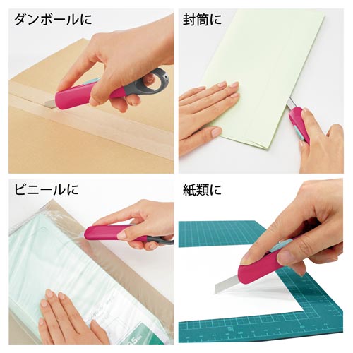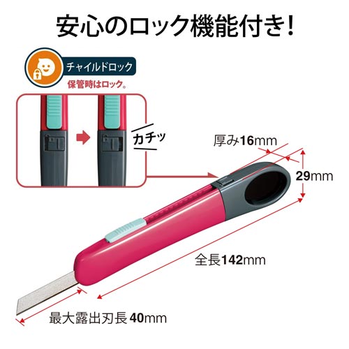 折らずに長持ち!あんぜん替刃で刃に触れることなく交換・廃棄が可能。スライダーとキャップの動きを固定するチャイルドロック付き。凹凸表面加工刃&フッ素コート加工刃。●寸法/幅142×奥行16×高さ29mm●本体カラー/ピンク●仕様/オートロック式●刃厚/0.5mm●替刃品番/CU-300R●刃幅/9mm●単位/1本