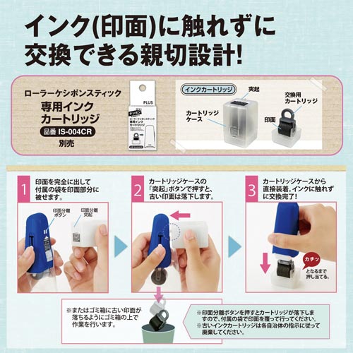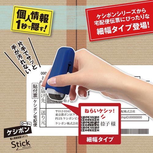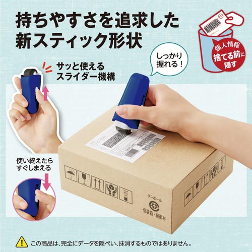 個人情報保護スタンプ。スリムな幅でねらいケシ。宅配ラベルやレシートなどに最適。●幅34×奥行33×高さ72mm、印面幅15mm●仕様/捺印距離:約20m分(300回捺印相当、1回70mmの場合)●カラー/ブルー●カートリッジ交換式/ IS-004CR●単位/1個
