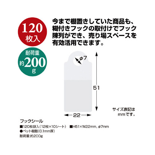 今まで棚置きしていた商品も、糊付きフックの取付けでフック陳列ができ、売り場スペースを有効活用できます。●寸法/H51×W22mm,φ7mm●材質/ペット樹脂(0.1mm厚)●仕様/120枚袋入(12枚×10シート)●単位/1冊(120枚)
