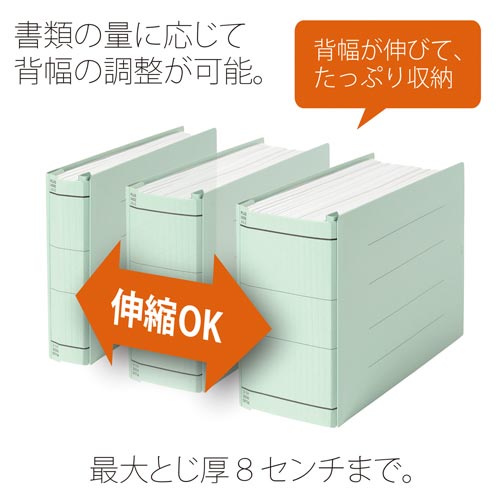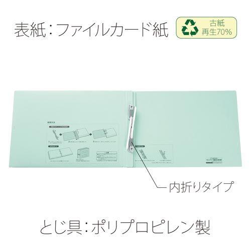 樹脂とじ具タイプ。背幅がのびて、最大800枚まで収容可能。●サイズ/A5ヨコ●寸法/縦155mm×横220mm×背幅18から98mm●カラー/ブルー●材質/表紙:ファイルカード紙、とじ具:PP●穴数/2穴●表紙厚/約0.47mm●最大収容枚数/約800枚●単位/1冊