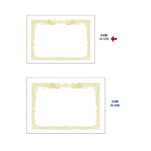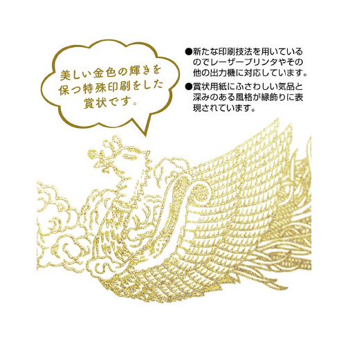 しっかりとした厚みのある高級賞状用紙です。幅広い用途のベーシックなホワイトベース。美しい金色の輝きを保つ特殊印刷をした賞状です。OA対応です。従来からの手書きや通常印刷にも使用できます。●紙厚/0.24mm●サイズ/H257×W364mm●材質/ケント紙(209g/平方m)●単位/1冊(10枚入)