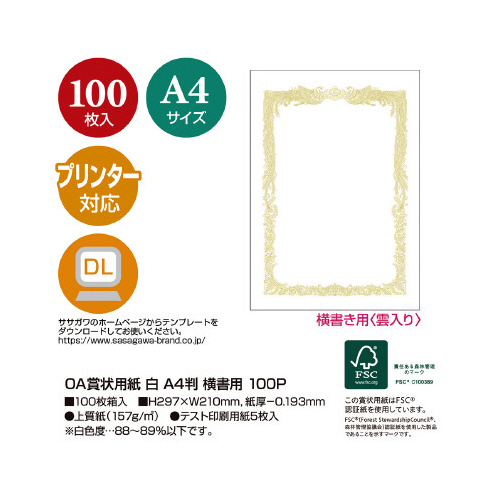 | 商品名 | OA賞状用紙 白 A4横書 100枚 |