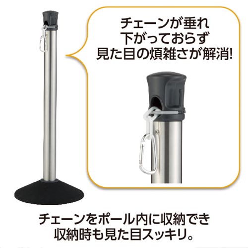 チェーン内蔵式で設置・撤収が効率的に行え、屋外の誘導・規制に使用できます。見た目もスタイリッシュで様々な施設にマッチします。●種別/屋内外対応●外寸法/直径約320×高さ860mm●チェーン長さ/最長4.3m●チェーン色/ホワイト●材質/本体:ステンレス・ポリプロピレン・ナイロン、チェーン:ポリエチレン、台座:ゴム・TPE●質量/約5.4kg●機能/チェーン内蔵式、くるっとロックでチェーンを好きなところで止められます、大型のカラビナと連結フック付●付属品/なし●付属工具/なし●生産国/日本●組立/お客様組立商品●組立必要人数/1人●組立時間/10分●必要工具/なし●単位/1台