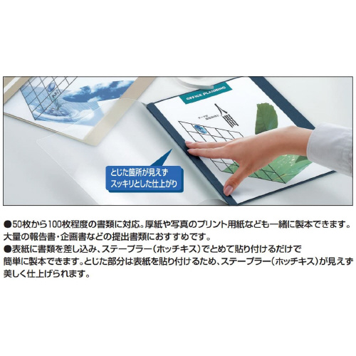 製本テープがない簡易タイプのレポートメーカー。背がきれいに仕上がるので提出用に便利なステープラーとじタイプ。オモテ:透明PP、ウラ:不透明の紙製タイプです。●サイズ/A4ヨコ●カラー/ダークグレー●収容枚数/約50枚●寸法(タテ×ヨコmm)/216×332●材質/表:PP、裏:カード紙(古紙パルプ配合)●単位/1パック(5冊入)