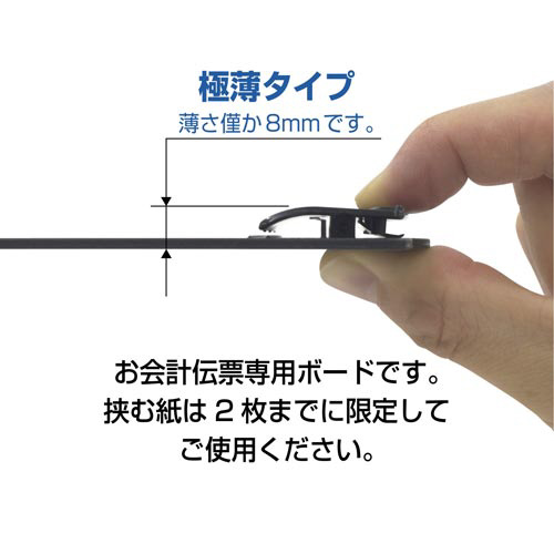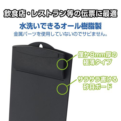 水洗いが可能なクリップボード。積み重ねてスッキリ収納できます。●種別/小●カラー/ブラック●寸法/本体サイズ:タテ116×ヨコ92×厚さ8mm、対応伝票サイズ:タテ90×ヨコ87mm●材質/ボード部:再生ABS●質量/25g●保持枚数/約2枚●単位/1枚