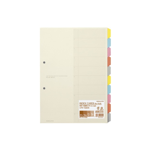 紙製の2穴インデックス。サイズ、山数で選ぶならコクヨのカラー仕切カード。●サイズ/A4タテ●種別/10山●寸法(タテ×ヨコmm)/297×210(+11)●穴数/2穴(80mmピッチ)●1組内容/5色10山見出し●材質/古紙パルプ配合●インデックス有無/インデックス付き●1パック内容/5組入り●※()内は見出し高さ●単位/1パック(5組入)
