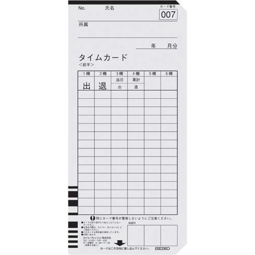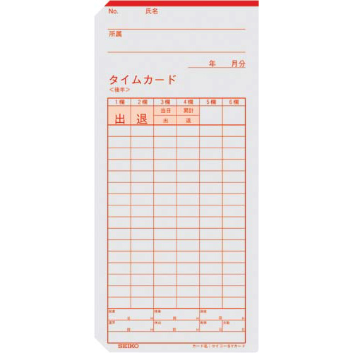 任意の締め日対応・日付印刷なし。セイコータイムレコーダー用の純正タイムカードです。●タイムカードタイプ/QRシリーズ用●種別/両面・6欄(全締日対応)●対応機種/QR-6560・375・385・395・450●仕様/日付印刷なし●単位/1箱(100枚入)