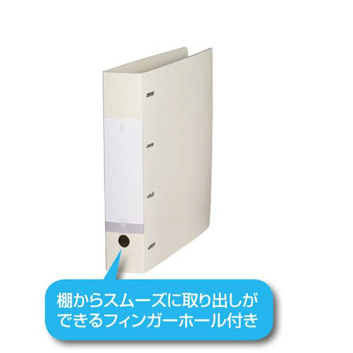 書類の抜き差しがしやすく、書類の端もそろうDリングファイル。表紙の裏側に便利なポケット、棚からスムーズに取り出しができるフィンガーホール付き。両手で開けるリングです。●サイズ/A4タテ●寸法(タテ×ヨコmm)/314×280●寸法/314×280●背幅(とじ厚)/64mm(50mm)●収容枚数/約500枚●カラー/白●種別/不透明表紙●表紙材質/再生PP●表紙厚/1.6mm●リング内径/50mm●穴数/4穴(80mmピッチ)●穴数種別/4穴●付属品/紙押さえ具付き●機能/背見出し紙は抜き差し可能●背紙種別/替背紙式●注釈/表紙ポケット・フィンガーホール付き●単位/1箱(10冊入)