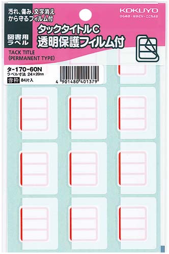 汚れを防ぐ透明保護フィルム付きラベル。●サイズ/フィルム寸法:34×30mm●種別/図書用ラベル●カラー/赤枠●寸法/24×20mm●材質/フィルム:OPP●入数/12片×7枚●単位/1パック