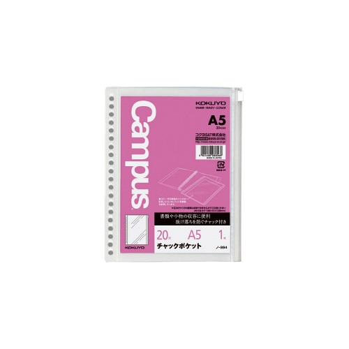 キャンパスのルーズリーフのポケット(関連用品)。●サイズ/A5●種別/チャックポケット●寸法(タテ×ヨコ)/212×161mm●材質/オレフィン系樹脂●穴数/20穴(丸穴)●枚数/1枚入●単位/1冊