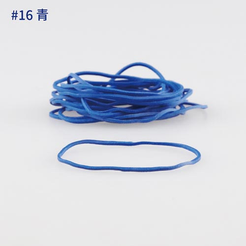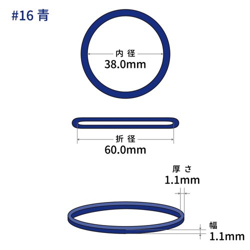 一般的に一番多く使われている標準サイズ#16です。●種別/No.16●カラー/青●容量/500g●内径×切幅/約38×約1.1mm●材質/天然ゴム●切幅/約1.1mm●厚み/約1.1mm●入数/約3000本入●本体内径/約38mm●単位/1袋