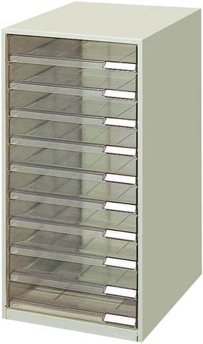 引き出しを開けずに中の書類を出し入れできる。よく使う書類の管理に最適です。●サイズ/A4●種別/10段(カルテタイプ)●カラー/ライトグレー●外寸法/幅256×奥行330×高さ492mm●引出内寸法/幅232×奥行311×高さ40mm●材質/本体:スチール(焼付塗装仕上げ)、引き出し:再生PS●最大積み重ね段数/積み重ね不可●機能/引き出しストッパーあり●単位/1個