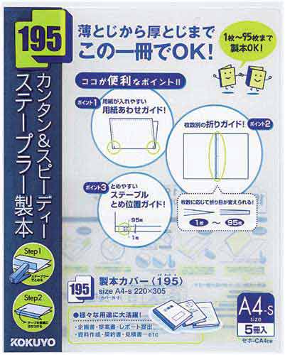 カバーに貼ってある製本テープで簡単スピーディに製本できます。オモテ:透明、ウラ:透明タイプになります。●サイズ/A4タテ●カラー/紺●収容枚数/約95枚●寸法(タテ×ヨコmm)/305×220●材質/本体:再生PP●単位/1箱(5冊入×20)