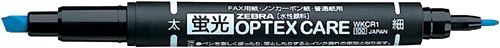 蛍光ペンの定番、「蛍光オプテックス」の使い切りタイプ。●線幅/平芯:4.0mm、丸芯:0.8ー1.1mm●ペン先/細字・太字角芯●インク色/青●インク種類/水性顔料インク(OA用紙対応)●インク方式/中綿タイプ●材質/再生材使用●種別/ツイン●タイプ/使いきりタイプ●単位/1箱(10本入)