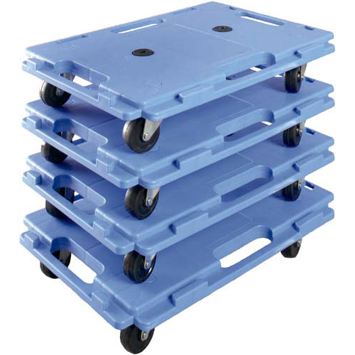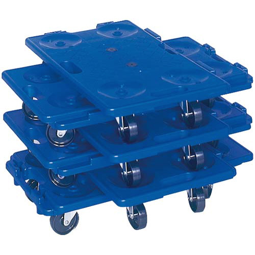100kgまで積めるミニサイズ平台車。タテヨコの連結も可能です。保管時は積み重ねることもできます。●耐荷重/100kg●質量/1.09kg●材質/本体:ポリプロピレン、キャスター:ノンカーボンゴム●キャスター寸法/直径50×幅20mm●機能/前輪・後輪ともに自在●寸法/幅305×奥行435×高さ88mm●カラー/ブルー●単位/1セット(3台入)