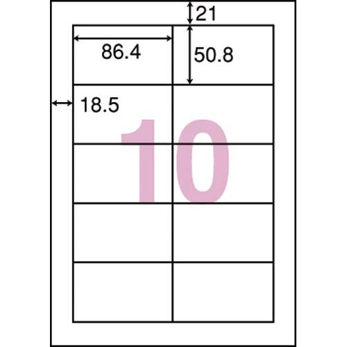 中袋に100枚ずつ入っているので、各部への振り分けや、保管に便利!●包装形態/100枚ずつ中袋入●種別/10面四辺余白付●サイズ/A4●対応プリンタ/レーザー(カラー・モノクロ)、コピー機(カラー・モノクロ)、インクジェット(染料・顔料)、熱転写●紙厚/総厚:134±10μm(ラベル本体:78±5μm)●ISO白色度/約91%●面付け/10面四辺余白付●カット数/10面カット四辺余白付●一片の大きさ/50.8×86.4mm●単位/1セット(500枚入×2)