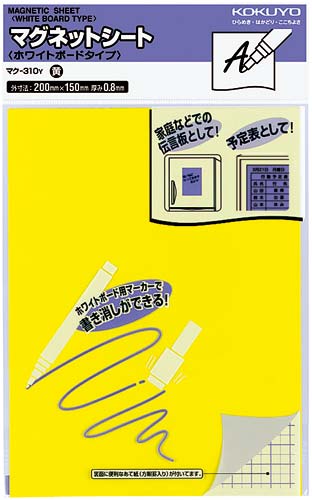 ホワイトボードマーカーで書き消しができる。簡易の伝言板として重宝します。●カラー/黄●寸法/タテ200×ヨコ150mm●厚さ/0.8mm●材質/表面:PVC-P+PPフィルム、裏面:マグネットシート●つや有無/つやあり●注釈/※油性マーカーで書いた文字は消去できません。※ホワイトボード用マーカーを使えば、書き消しができます。●単位/1枚