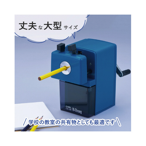 大容量のくず箱は何度もくずを捨てる手間が省けます。削る鉛筆の表面に傷がつかないようにゴム製チャックを採用しています。鉛筆が削りあがると、ハンドルが軽くなるムダ削り防止機能付です。●寸法/幅81×奥行145×高さ154.5mm●質量/420g●材質/ABS、鋼板●カラー/ブルー●単位/1個