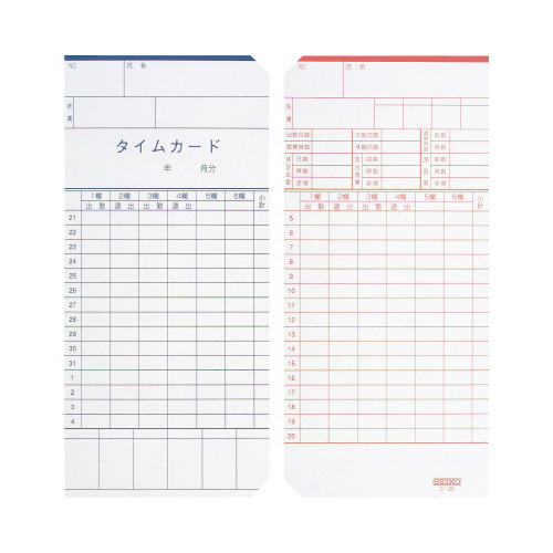 20日締め用・日付印刷あり。セイコータイムレコーダー用の純正タイムカードです。●タイムカードタイプ/QRシリーズ用●種別/両面・6欄(20日締め)●対応機種/QR-100・120・311・330・340・350・395・411・421・4550・550・6560・721・723・725・825・827・900●仕様/日付印刷あり●単位/1箱(100枚入)