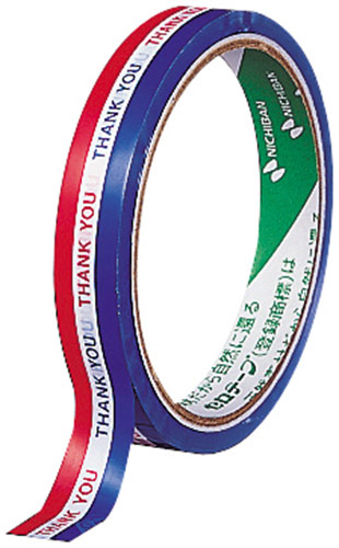 お客様へありがとうのメッセージ入り!商店向けの既製印刷入セロハンテープ。●寸法/幅15mm×長さ25m×紙管径3インチ●厚さ/0.05mm●種別/三色旗・THANK YOU●基材/セロハン●粘着剤/ゴム系●カッターなし●巻芯は再生紙●単位/1箱(10巻入)