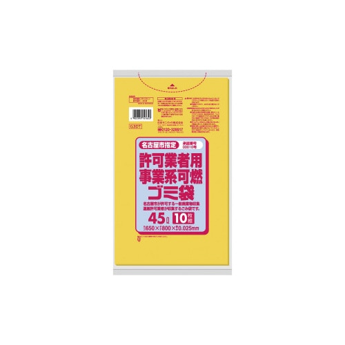 名古屋市事業系可燃ゴミの45Lになります。シャカシャカした手触り(HD材)の45L厚み0.025mmタイプ。●種別/45L●カラー/黄色●寸法/ヨコ650×タテ800mm●材質/HDPE●厚さ/0.025mm●容量/45L●単位/1パック