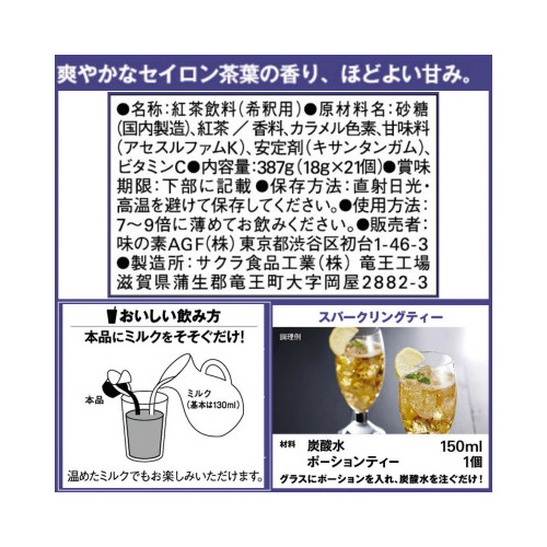 爽やかなセイロン茶葉の香り、ほどよい甘み。●種別/濃縮紅茶●容量/18g×8●賞味期限/商品の発送時点で、賞味期限まで残り130日以上の商品をお届けします。●単位/1セット(21個入×2)