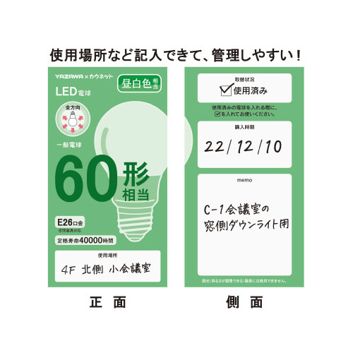 | 商品名 | メモ欄付きで管理しやすいLED電球 60W 昼白色 |