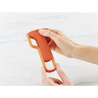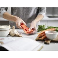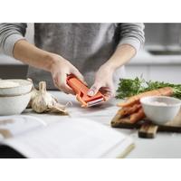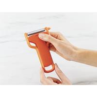 切れ味の良いステンレス製ブレードと、持ちやすいY字型のデザインで素早く簡単に皮むきができます。ハンドル部分をスライドさせるだけで刃がカバーされ、いつでも安全に保管できます。ジャガイモの芽取り付き。●寸法/75×18×140mm●質量/38g●材質/ボディ:ABS樹脂やポリプロピレンや熱可塑性エラストマー、刃:ステンレススチール●耐熱温度/70度●生産国/中国●カラー/オレンジ●食洗器使用の可否/可●単位/1個