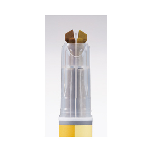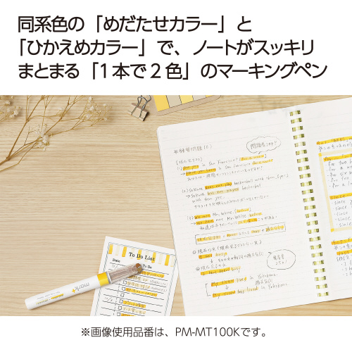 同系色の「めだたせカラー」と「ひかえめカラー」で、ノートがスッキリまとまる「1本で2色」のマーキングペン●ペン先/特殊角芯●インク色/ゴールド●インク種類/水性顔料インク●材質/軸・キャップ:PP、内尾栓:R-PP●寸法/軸径15mm×長さ131mm●単位/1本