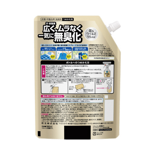 1プッシュでシューッとワイドに広がる。汗・皮脂臭広く、ムラなく、一気に無臭化●種別/詰替用●容量/660ml●香り/無香料●仕様/衣料用消臭剤●単位/1セット(5パック入)