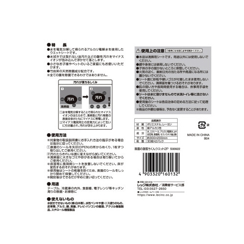 ※本品は清掃用シートです。用途以外に使用しないでください。※顔や身体には使用しないでください。※子供の手の届かないところに保管してください。※火気の近く、直射日光の当たる所や高温になる所には置かないでください。※シート面に砂粒や硬いゴミが付着したまま使用しないでください。清掃面を傷つける恐れがあります。※肌の弱い方や長時間使用する場合は、掃除用手袋を使用してください。※シートは水に溶けませんので水洗トイレ等に流さないでください。※使用後のシートは各自治体の定める方法に従って処理してください。※商品の外観仕様等は、予告なく変更することがあります。