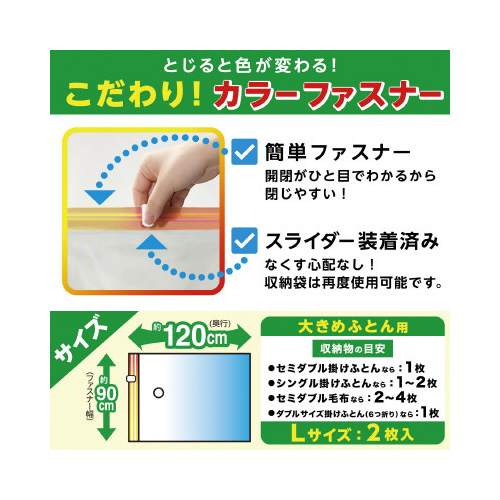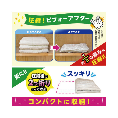 ※ダウン70%以上の羽毛製品に使用できます。羽根製品やフェザーの多い羽毛製品には使用しないでください。(羽根が折れて厚さが戻らなくなったり、圧縮袋をキズつけて空気もれの原因となります。)また、起毛処理された物(毛足の長い物)皮革製品にも使用しないでください。収納物の材質表示をご確認の上ご使用ください。圧縮に適しているか不明な場合は、ふとん・毛布をお買い上げの店舗メーカーまでお問い合わせください。※収納物は充分に乾燥させてください。※収納物のサイズ・厚みなどにより収納枚数は異なります。※収納物の入れすぎは空気もれの原因となります。※収納物の素材・種類・使用状況・量により圧縮率・回復率は異なります。