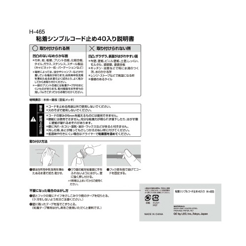 ※コードを止める用途以外で使用しないでください。※火のそばで使用しないでください。※コードの厚みが6mmを超えるものには使用できません。※壁紙には使用できません。充分な粘着力が得られず落下したり、はがす際に壁紙が破れるおそれがあります。※壁に汚れ・ホコリ・湿気・油分・ワックスなどがあると付きません。※外した時、あとが残ってもさしつかえのない所に付けてください。※低温時や付きにくい場合はドライヤーで粘着面を温めてください。