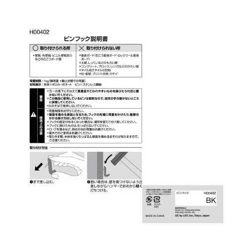 ※万一の落下にそなえて貴重品やこわれやすいものを掛けたり付近に置かないでください。※この商品に使用しているピンは鋭利なので、幼児の手の届かないところに保管してください。※火のそばで使用しないでください。※荷重制限をお守りください。※壁面を傷める原因となるため、フックの先端に荷重をかけたり、衝撃のかかる掛け方はしないでください。※フックの固定がゆるくなった場合は、場所を替えて付け直してください。※フックに掛けたものは、引っぱらないでください。※ロープを張るなど、斜め方向の荷重はお避けください。※屋外でのご使用はお避けください。※取り外す際、本体を強く引っぱると壁面を傷めるおそれがありますので、ご注意ください。