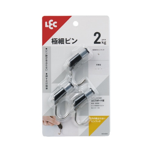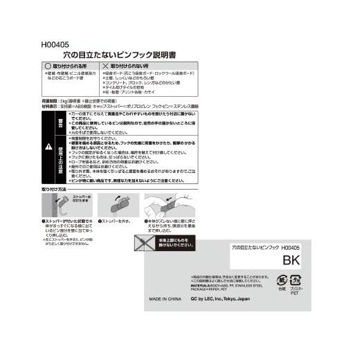 ※万一の落下にそなえて貴重品やこわれやすいものを掛けたり付近に置かないでください。※この商品に使用しているピンは鋭利なので、幼児の手の届かないところに保管してください。※火のそばで使用しないでください。※荷重制限をお守りください。※壁面を傷める原因となるため、フックの先端に荷重をかけたり、衝撃のかかる掛け方はしないでください。※フックに掛けたものは、引っぱらないでください。※ロープを張るなど、斜め方向の荷重はお避けください。※屋外でのご使用はお避けください。※取り外す際、本体を強く引っぱると壁面を傷めるおそれがありますので、ご注意ください。※ピンが特に細い商品です。無理な力を加えないようにご注意ください。