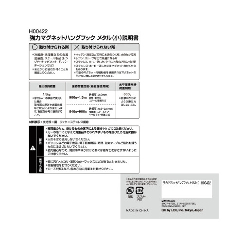 ※高荷重のため、掛けるものの落下による破損やケガにご注意ください。※万一の落下にそなえて貴重品やこわれやすいものを掛けたり付近に置かないでください。※火のそばで使用しないでください。※パソコンなどの電子機器・電子医療機器・時計・磁気テープなど磁気を嫌うものには近づけないでください。※強力磁石なので、開封時や取り付ける際には指などをはさまないようにご注意ください。※壁に汚れ・ホコリ・湿気・油分・ワックスなどがあると付きません。※荷重制限をお守りください。※ロープを張るなど、斜め方向の荷重はお避けください。