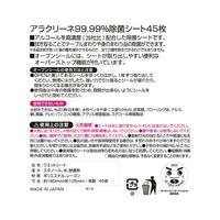 高濃度アルコール配合の99.99%除菌シート。●シート寸法/約125×180mm●成分/エタノール、水、除菌剤●材質/ポリエステル・レーヨン●種別/ウエット●タイプ/シート●枚数/45枚入(1個)●アルコール/有●生産国/日本●単位/1ケース(5個入×8パック)