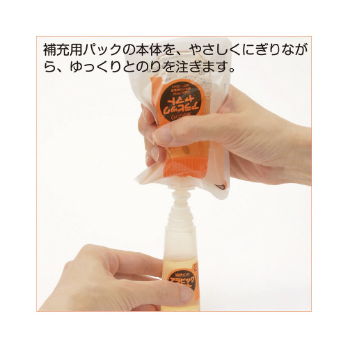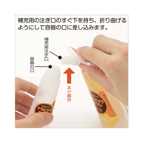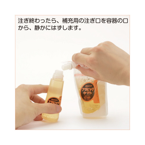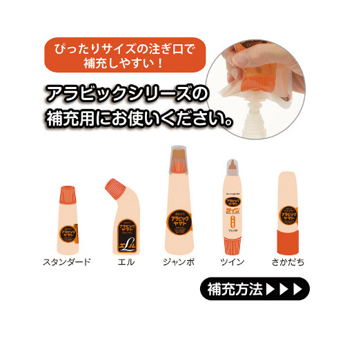 ※補充後は、注ぎ口と容器の口についた余分なのりを拭きとってください。※ホジュウ語はキャップをしっかりしめて、立てて保管してください。※他社製の液状のりをアラビックシリーズにホジュウするとスポンジの目づまりなどが生じますので、お避け下さい。※接着以外に使用しないでください。※直射日光や高温多湿を避けて保管してください。※用事の手の届かないところに保管してください。